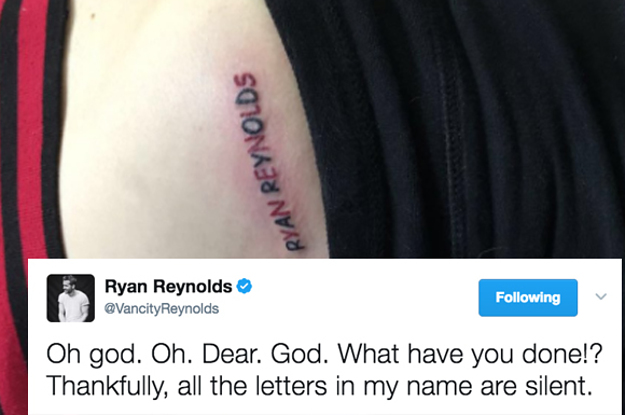 Ryan Reynolds (With images) | Ryan reynolds, Tattoo quotes ... from i.pinimg.com The twitter post included a picture of the name ryan reynolds tattooed on the fan's bare butt, printed in. If ryan reynolds didn't know who his most devoted fan was before, he sure does now. And ryan reynolds being ryan reynolds, obviously liked that tweet. Ryan reynolds fat ryan reynolds tattoo ryan reynolds shirtless shirtless men jon kortajarena joe manganiello matthew mcconaughey chris hemsworth beautiful men. Gq cover star ryan reynolds on filming deadpool and life as a father. We would personally be thrilled with the tribute. Ryan reynolds may be attractive and charming, but who would have thought the actor had the power to convince a male fan to tattoo the actor's name on his butt? Some of his most prominent roles are usually it's covered up. ryan reynolds lines tattoo.